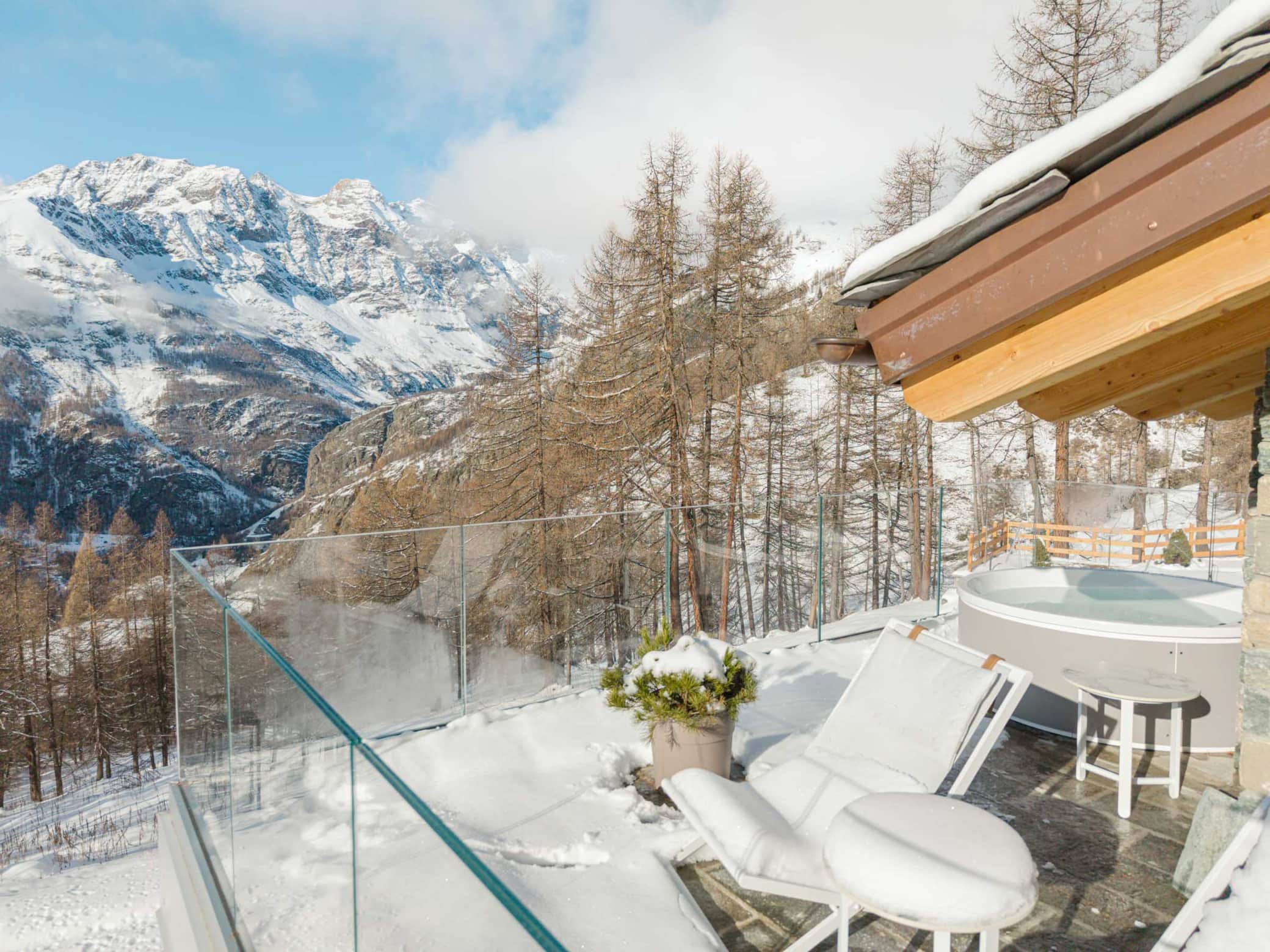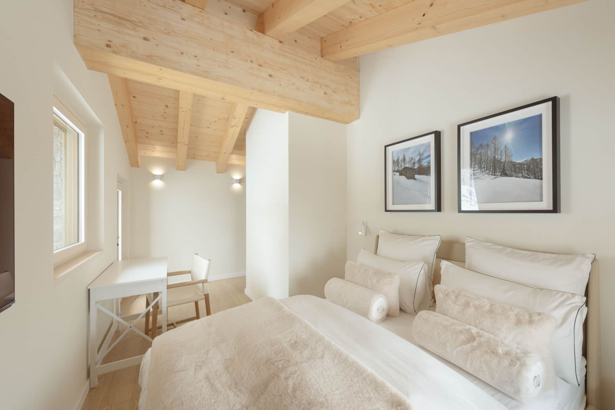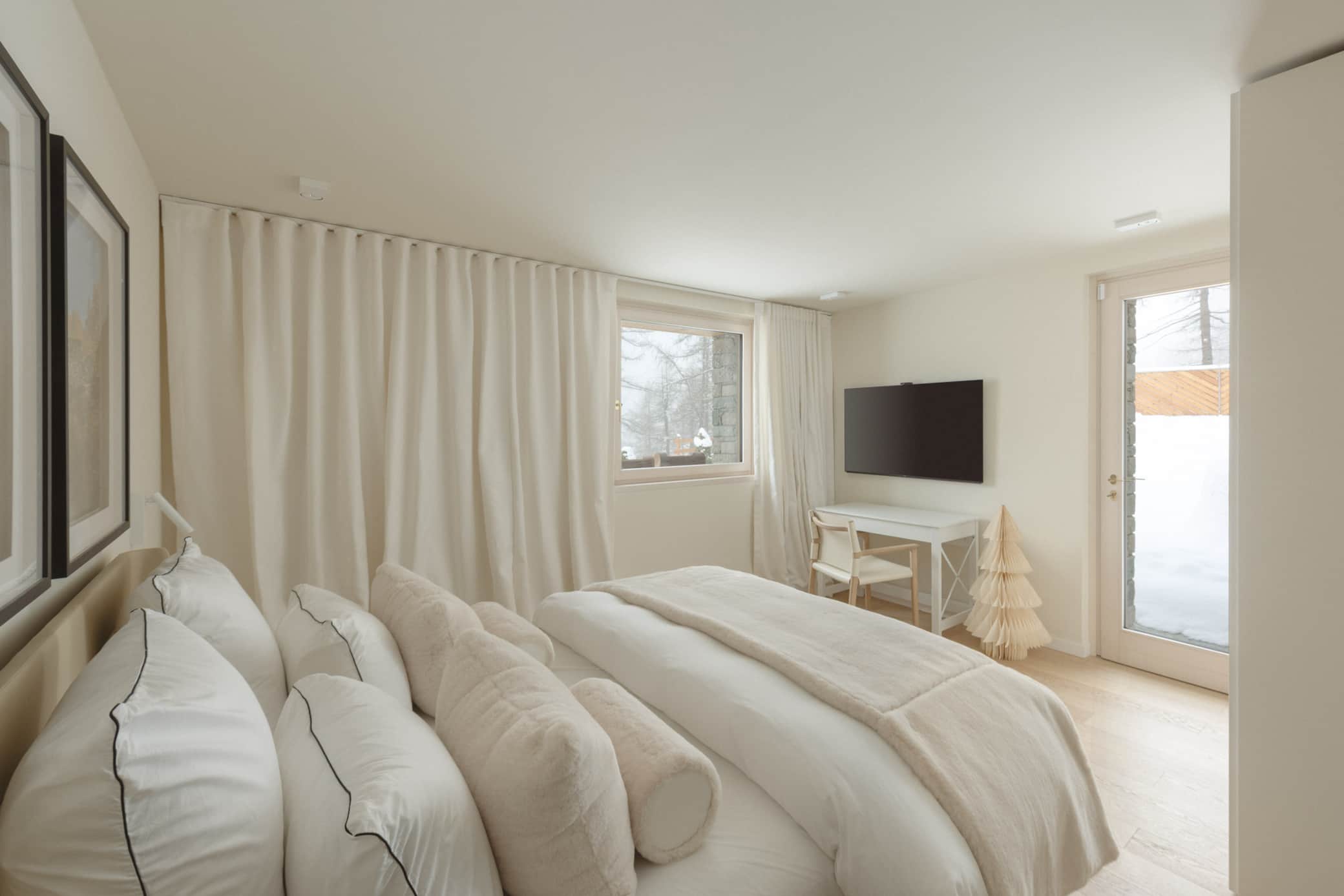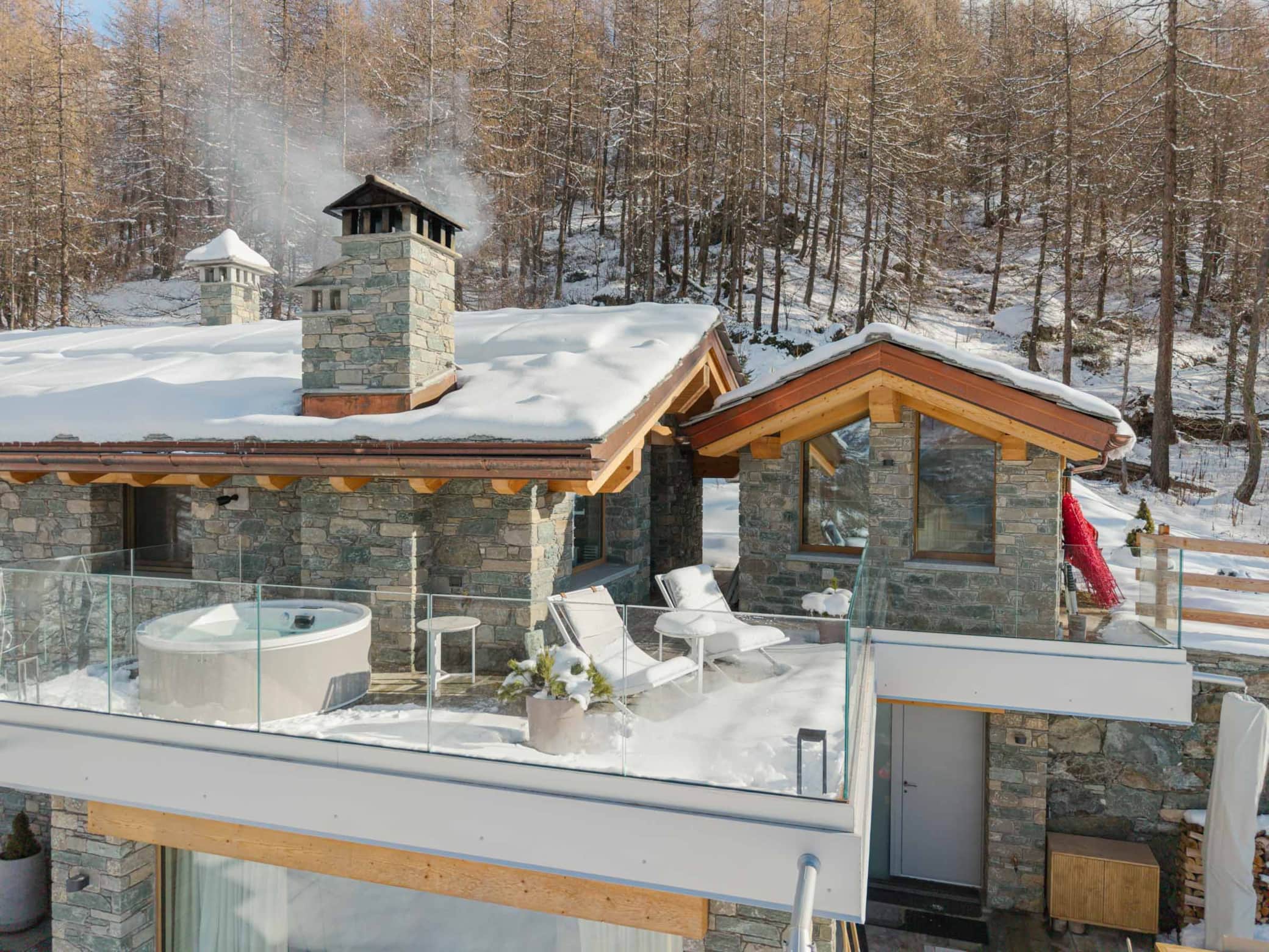 Our luxury chalet boasts three sophisticated bedrooms, each with its own designer bathroom, and a grand living room featuring a statement fireplace. For ultimate relaxation, indulge in our premium wellness area complete with hammam, sauna, and a spectacular outdoor jacuzzi offering panoramic Alpine vistas.